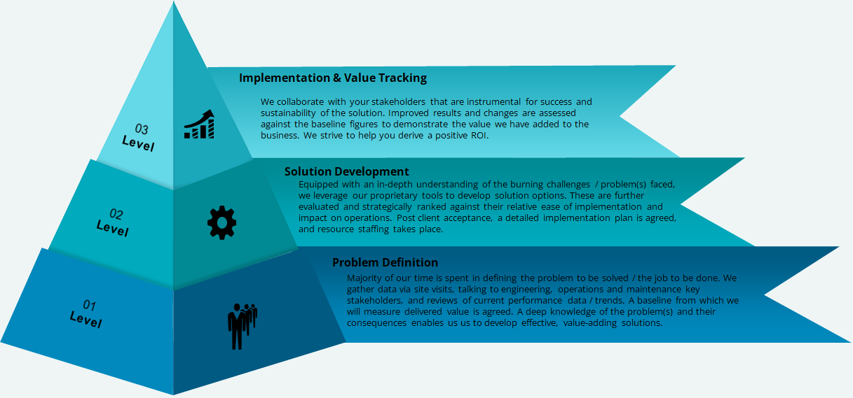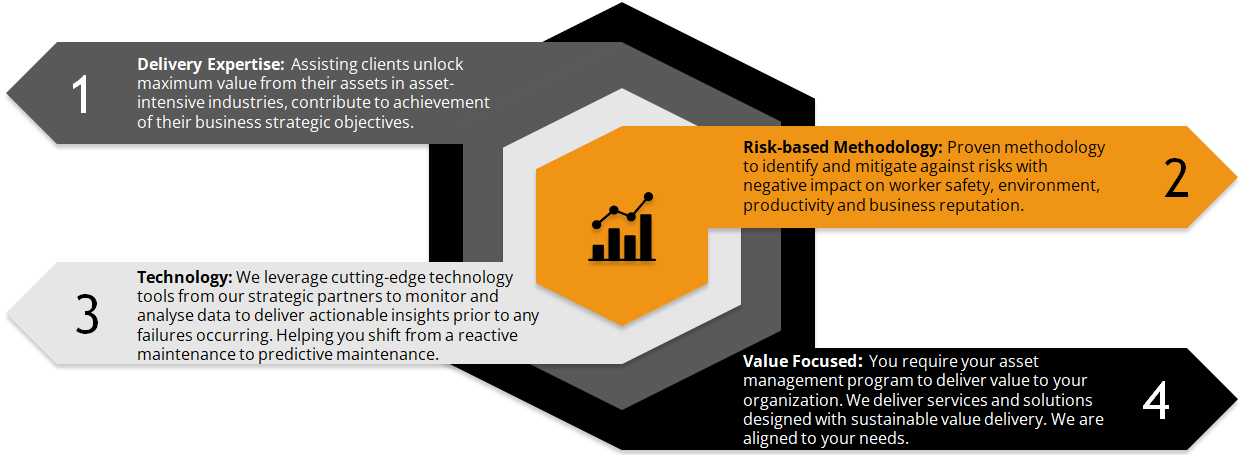 We help elevate our clients from fire-fighting to higher levels of maintenance maturity by improving their asset availability, reliability and production efficiency whilst reducing unplanned downtime, safety and environmental risks, and asset life cycle costs.