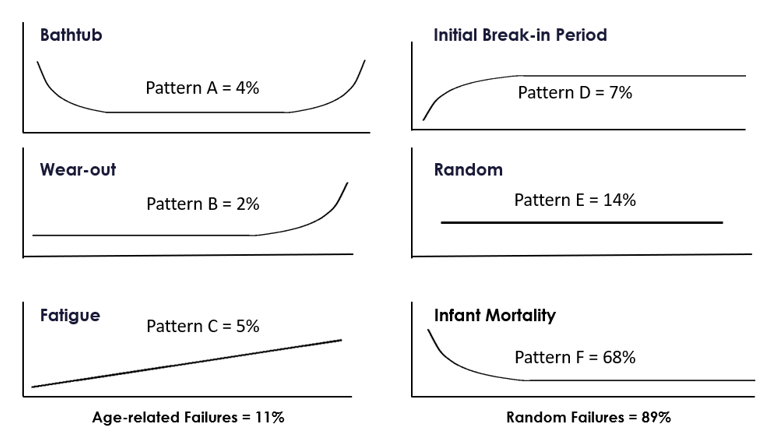 Referring to Figure 1, typically only 2% of equipment failures follow a wear-out pattern in which routine preventive maintenance (PM) i.e., periodic overhauls, repairs, or parts replacements, etc. makes sense. The wear-out pattern assumes that equipment will experience a few random, constant failures, after some time its probability of failure will sharply increase. Therefore, PM should be done prior to reaching the wear-out zone. The most important thing from these graphs is that only about 11% of equipment failures are purely age-related and have failure patterns matching the bathtub, wear-out and fatigue curves. Figure 1 also shows that most equipment failures, over time, are random at 89%. This has profound implications on equipment maintenance strategies.