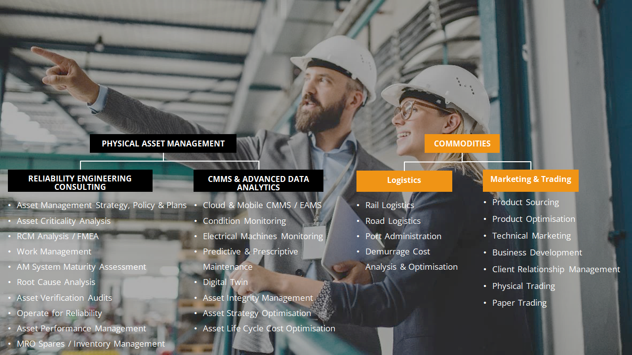 We provide cost-effective, cloud-based Centralised Maintenance Management System (CMMS) / Enterprise Asset Management System (EAMS) for effective work management (planning, scheduling, execution, reporting). Clients benefit from a SaaS solution that will help drive increased compliance to maintenance schedules, effective utilization of resources to increase wrench time and value-added improvement in assets uptime.