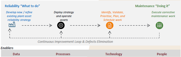 Driven by a need to follow industry trends and current buzzwords for sake of bragging about digitalised operations, whilst lacking core reliability and maintenance foundations, does not come close to being a solid business case for the investment required. What do we mean by reliability and maintenance foundations? Reliability and maintenance, although interrelated, they are not the same thing. They are characterised by two elements i.e., program, the “what to do”, and execution, the “doing it”. Reliability is focussed on definition of asset strategies, maintenance plans and rooting out defects related to repeated asset failures (program). Maintenance involves identifying, planning, scheduling, and performing of maintenance work (execution). Both are underpinned by key several enablers – people, processes, data, and technologies – to improve asset availability, maintenance cost reduction and productivity, key objectives for business, as show below.