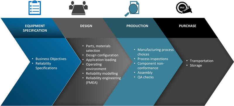 The design reliability depends on reliability specification at the maintainable component level. Inherent reliability, therefore, refers to the maximum achievable level of reliability that is established through the design choices and manufacturing processes of your piece of equipment or system. Inherent reliability is influenced by various factors along the asset’s life cycle stages, as shown in Figure 3.